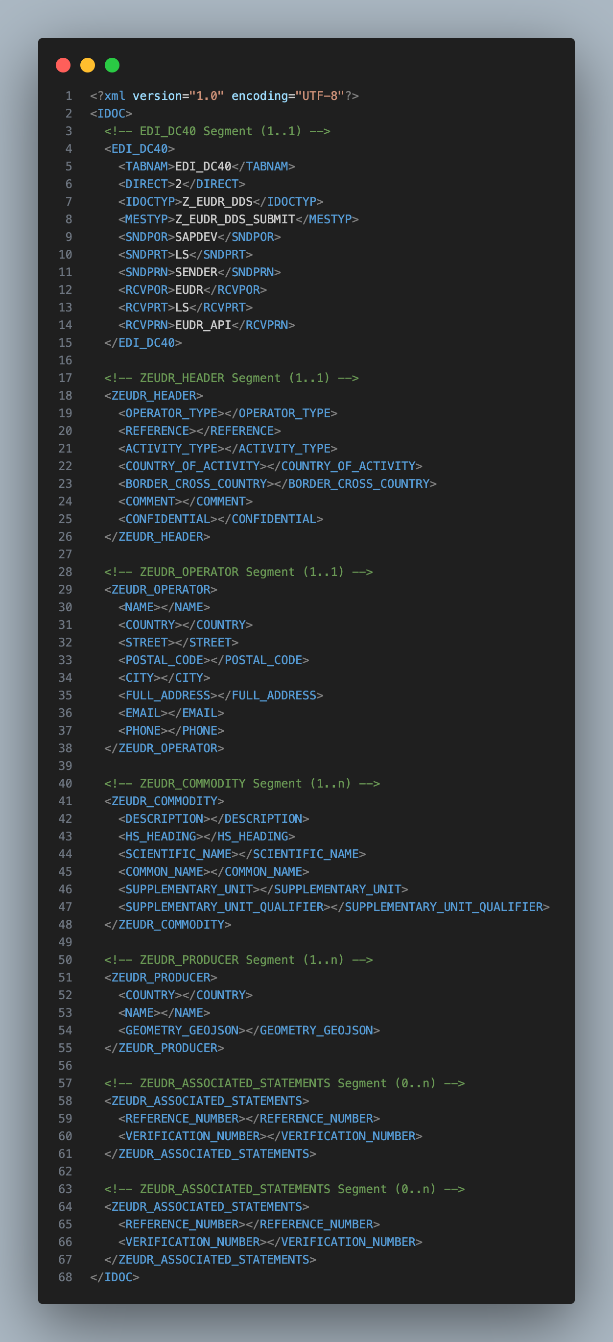 π Each iDoc contains a specific message type (MESTYP) which determines what type of EUDR operation it represents (e.g., DDS Submit).